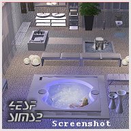 | The gift includes the following files: 50 files: 20 new meshes: 1. Tub 2. Blanket 3. Sink 4. Mirror 5. Wall lamp 6. Floor lamp 7. Hottub 8. Plant 9. Coffeetable 10. Cabinet 11. Vases 12. Scales 13. Towelrack 14. Bench 15. Sideboard 16. Deco Box 17. Fountain (requires EP University/NL) 18. Lounge chair (requires EP University/NL) 19. Toilet 20. Toilet brush deco + 30 recolors All items are tested in game with EP University + Nightlife and work fine, they are (no guarantee can be given for further Expansion Packs) |