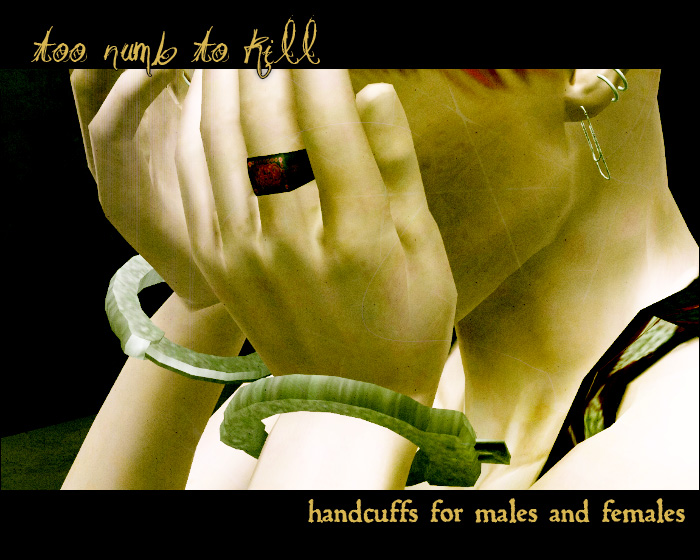 A conversion of my TS2 handcuff bracelets, for males and females, teen through elder. Comes in three versions - left, right, and both. The dual version has two castable parts for mixing or matching between the cuffs. These things are a serious pain in the ass to get pictures of.
